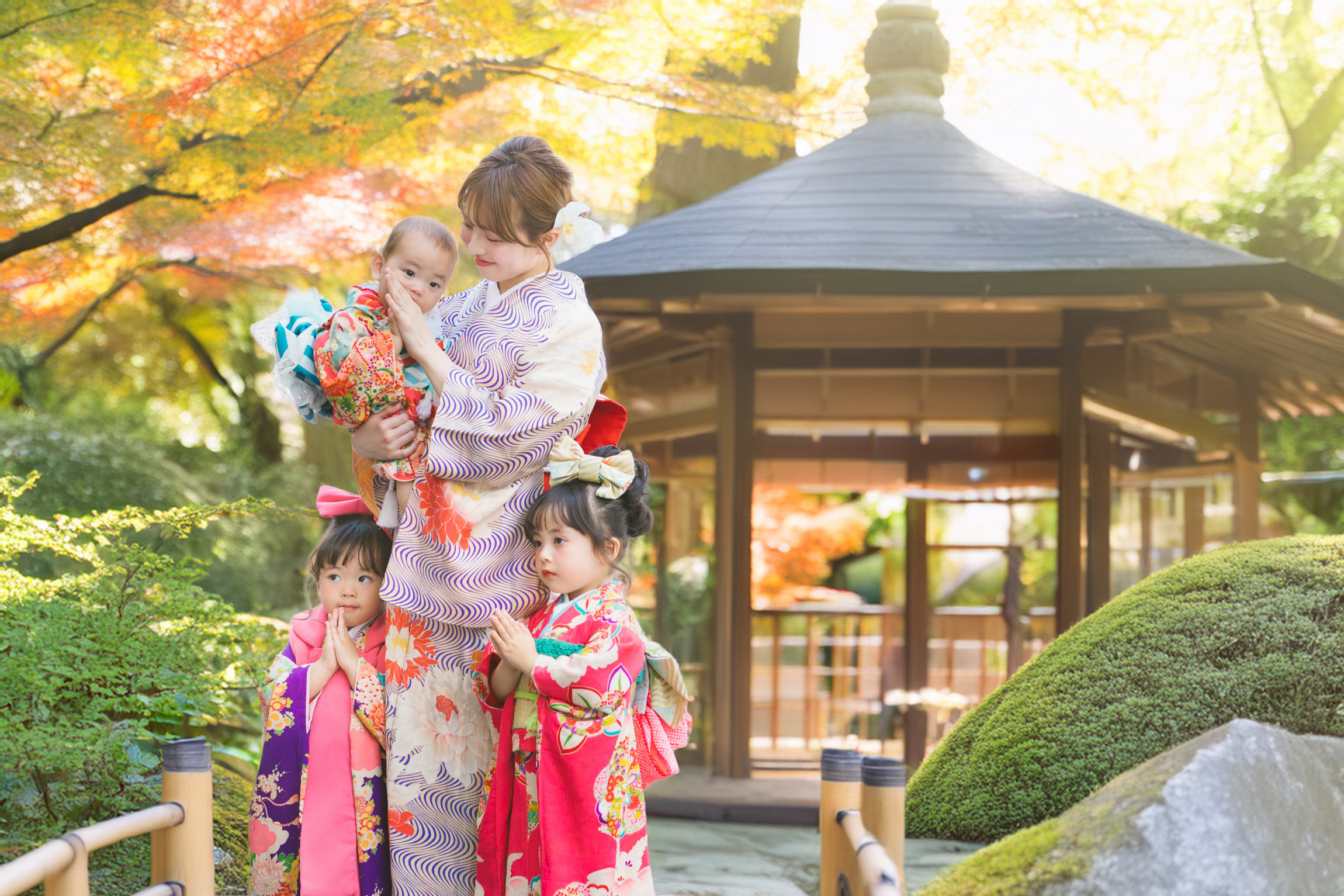 3歳は被布チェンジ、5歳は羽織チェンジ、7歳は帯チェンジで和装バリエーション豊富